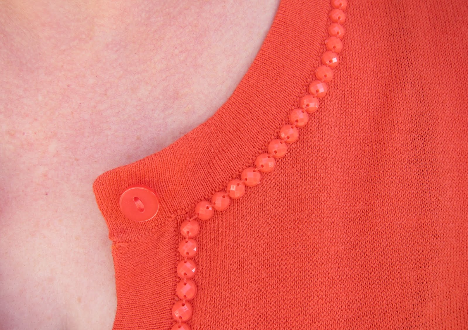 Wearing: orange cardi and blue tank, Target; pants, Macy’s; and bracelet—my own creation. How do you like this color combo?